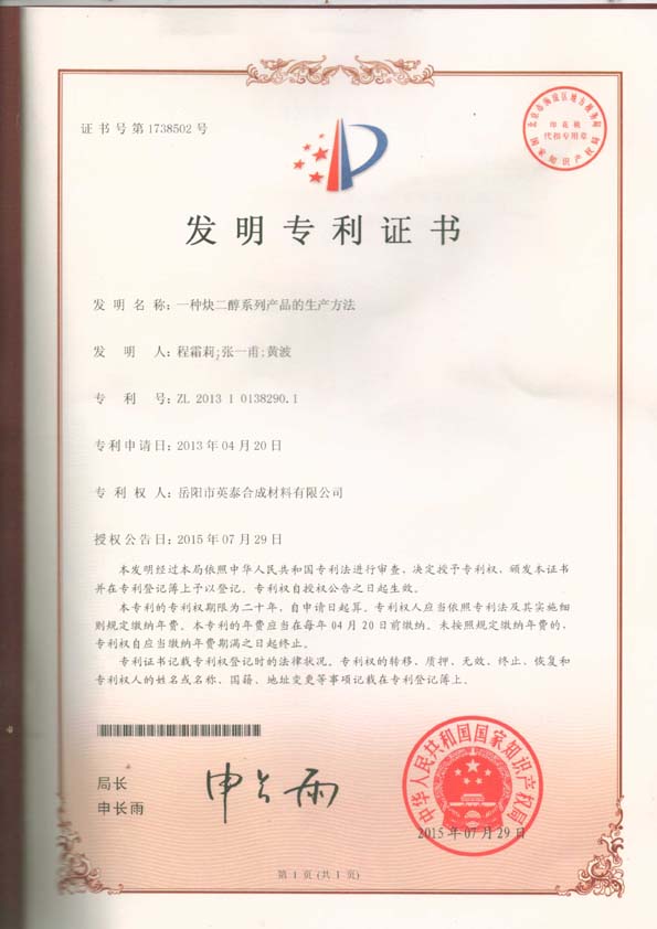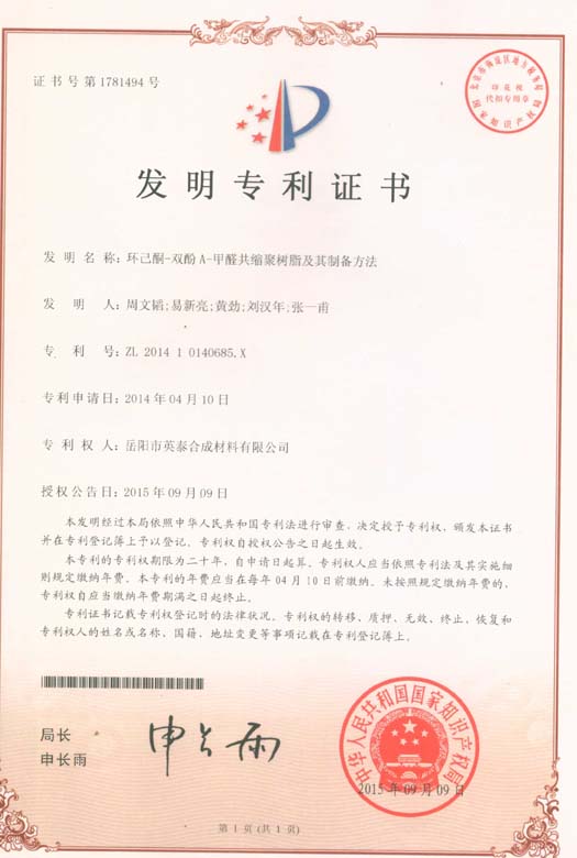 我司分別于2015年7月29日、9月9日榮獲兩項(xiàng)國家專利“一種炔二醇系列產(chǎn)品的生產(chǎn)方法”、“環(huán)己酮-雙酚A-甲醛共縮聚樹脂及其制備方法”。
